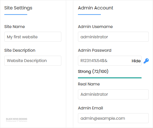 • Admin Username: Your new Joomla username (for security reasons, do not use the administrator or the admin username).
